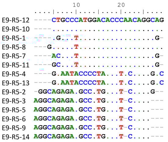 Alignment of sequences recovered from round 5 of PT SELEX with vaccinia virus protein E9. A Clustal alignment was performed using the BioEdit program with the sequence of E9-R5-12 as the reference. Only the 25 nts from the random region of the starting material are shown (sequence of primer strand, see Section 2). Sequence names indicate the protein used in the PT SELEX (E9), the SELEX round (round 5 (R5)) and the sequence number.