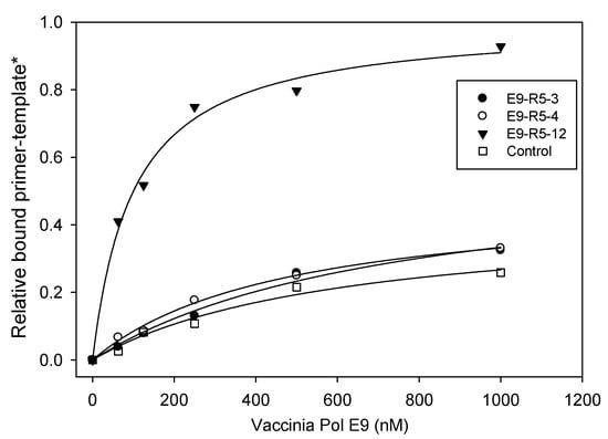 The following supporting information can be downloaded at: https://www.mdpi.com/article/10.3390/v14020369/s1, Figure S1. Dissociation of E9 vaccinia virus polymerase from P/T constructs select with E9 or other proteins (see Table 1) shows that only E9-R5-1 binds stably; Figure S2. Extension of selected radiolabeled primer-templates with E9 polymerase shows that all primer templates are extended in a similar fashion and the E9-R5-12 is not extended better than P/T constructs selected with other polymerases; and Table S1: Primer-template sequences selected by PT SELEX examined for binding and extension with vaccinia virus polymerase (E9).