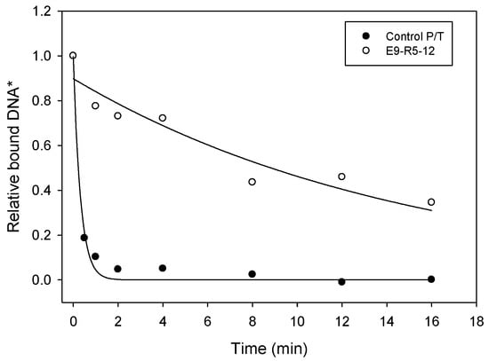Dissociation rate constant (koff) analysis of E9-R5-12 P/T sequence. Experiments were performed using nitrocellulose filter binding, as described in Section 2. * Values are relative to the value for the amount of DNA bound to E9 at time “0” (see Section 2), which was set to “1”. The sequences of the Control P/T and E9-R5-12 double-stranded DNA sequences are shown in Table 1.