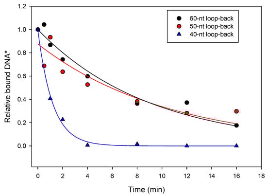 Dissociation rate constant (koff) analysis of loop-back sequences derived from the E9-R5-12 P/T sequence. Loop-backs are described in Section 3 and shown in Table 1. Experiments were performed using nitrocellulose filter binding, as described in Section 2. * Values are relative to the value for the amount of loop-back DNA bound to E9 at time “0” (see Section 2), which was set to “1”.