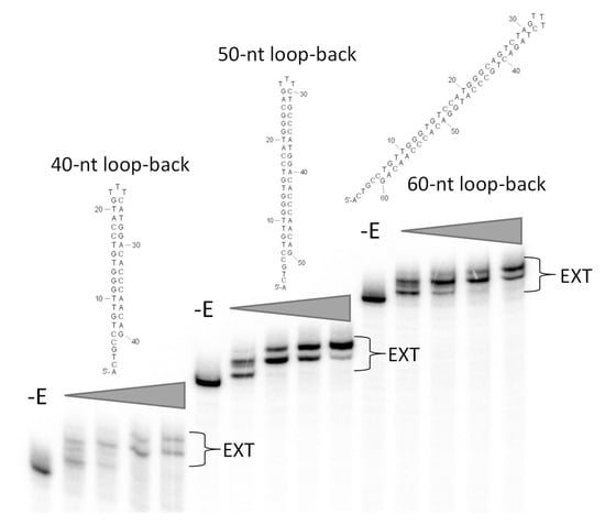 Previously selected P/T sequences from RTs [,] and Taq and Klenow polymerases [] contained biologically relevant sequences (resembling the PPT in the case of RTs), or sequence regions with homology to phage RNA polymerase promoter sequences (for Taq and Klenow). We searched for E9-R5-12-related sequences in the enriched results for RTs, Taq and Klenow, but could not find any resemblance. To further examine possible relationships between E9-R5-12 and previously recovered tight-binding P/Ts to other polymerases, we conducted binding dissociation and primer extension experiments using E9 (Supplemental Materials. Primer–templates selected with PT SELEX for HIV RT, Taq and Klenow dissociated rapidly from E9 (Table S1 and Figure S1). Like the control shown in Figure 3, the dissociation was too fast to determine a dissociation constant using filter binding. Interestingly, all the P/Ts were extended in primer extension reactions, and there was no clear advantage for the extension of the E9-R5-12 sequences compared to the others (Figure S2). This was synonymous to the experiment with the 40 nt loop-back in Figure 5, which, despite binding less stably to E9 (Figure 4), was extended similarly to the 50 and 60 nt loop-backs (Figure 5). We should note that the two assays use different reaction conditions, with the primer extension assays containing Mg2+ and dNTPs that are not included in the binding dissociation assays (see Section 2.2). These could have affected binding to E9. Magnesium could not be added to the binding assays, as it would activate the 3′-5′ exonuclease activity of E9, leading to erroneous measurements.