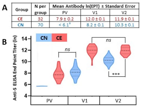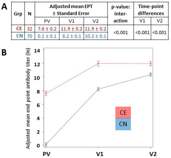 | N | Adjusted Mean Antibody Ln (EPT) ± Standard Error | p-Value: Interaction | Time-Point Differences | ||||