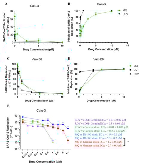 The antiviral effect of mefloquine against SARS-CoV-2. Calu-3 (A,B,E) or Vero E6 (C,D) were infected with SARS-CoV-2 D614G (A–D) or gamma strain € at MOI 0.01 (Vero) or 0.1 (Calu-3), for 1 h at 37 °C. Inoculum was removed and cells were incubated with fresh DMEM containing the indicated concentrations of mefloquine (MQ), chloroquine (CQ), or remdesivir (RDV). Virus titers were measured by PFU/mL in the culture supernatants at 24 h post infection (hpi) for Vero (C,D) or 48 hpi for Calu-3 (A,B,E) cells. Results are displayed as virus titers (A,C,E) or percentage of inhibition (B,D). The data represent the means ± SEM of three independent experiments. * p < 0.05.