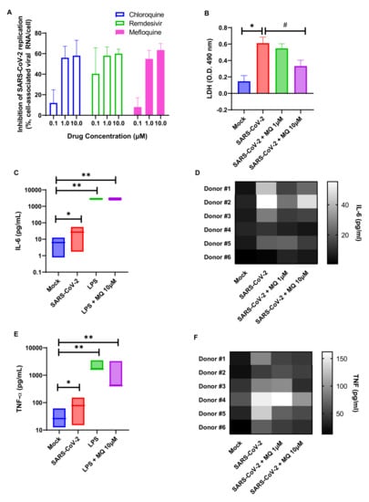 Mefloquine reduces the viral load and viral-induced enhancement of IL-6 and TNF-α in SARS-CoV-2-infected monocytes. Primary human monocytes isolated from health donors were infected with SARS-CoV-2 at an MOI of 0.01 for 1 h at 37 °C. Inoculum was removed and cells were treated with the indicated concentrations of mefloquine (MQ), chloroquine (CQ), or remdesivir (RDV). Virus replication (A) and LDH (B), IL-6 (C,D), or TNF-α (E,F) levels were assessed in the culture supernatants at 24 h post-infection. The data represent the means ± SEM of monocytes from at least 5 healthy donors. Ns: not significant, * p < 0.05, # p < 0.05 and ** p < 0.01.