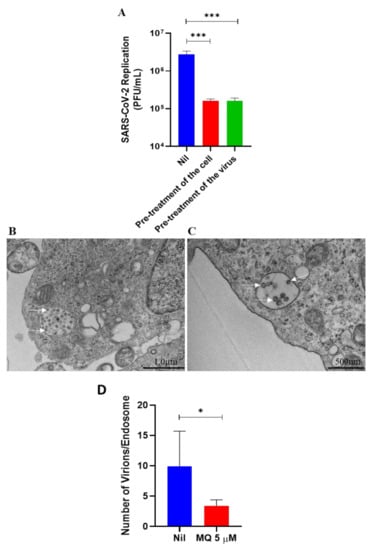 Effects of mefloquine on SARS-CoV-2 endocytosis-mediated entry. (A) To initially evaluate mefloquine’s effect on virus entry, Calu-3 cells or SARS-CoV-2 virus particles were pre-incubated with 1 µM of mefloquine for 1 h at 37 °C and then infected at an MOI of 0.1. After 24 hpi, culture supernatants were harvested, and SARS-CoV-2 replication was measured using the plaque assay. Results are displayed as virus titers (PFU/mL). (B,C) Representative images (from 4 independent experiments) of ultrastructural analysis by transmission electron microscopy of Vero E6 cell infected with an MOI of 1 of SARS-CoV-2 (B) and treated with 5 µM of mefloquine for 4 h (C). Cell endosomes with spherical SARS-CoV-2 virus particles (white arrows). (D) SARS-CoV-2 virus particles were counted inside the endosomes of Vero E6 cells treated with mefloquine or not (nil). * p < 0.05 and *** p < 0.01.