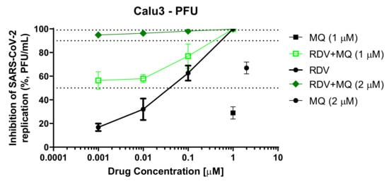 Mefloquine enhances the anti-SARS-CoV-2 activity of remdesivir. Calu-3 cells were infected with SARS-CoV-2 at an MOI 0.1 for 1 h at 37 °C. Inoculum was removed and cells were treated with 1 or 2 µM of mefloquine combined with the indicated concentrations of remdesivir (RDV). Virus titers were measured by PFU/mL in the culture supernatants after 48 hpi. Results are displayed as the percentage of inhibition.