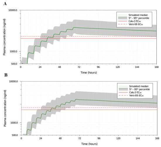 Mefloquine’s PBPK model predicted the plasma concentration for different dosages. Predicted mefloquine plasma concentration for 450 mg TID (A) or 350 mg QID (B) doses for 3 days. The dotted and the solid lines represent the EC90 values of mefloquine for SARS-CoV-2 in Vero E6 and Calu-3 cell types, respectively.