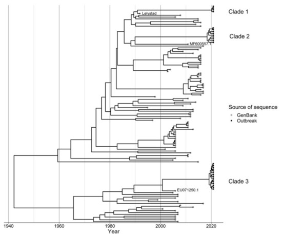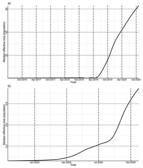 - Rambaut, A.; Lam, T.T.; Max Carvalho, L.; Pybus, O.G. Exploring the Temporal Structure of Heterochronous Sequences Using TempEst (Formerly Path-O-Gen). Virus Evol. 2016, 2, vew007. [Google Scholar] [CrossRef] [Green Version]