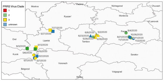 Map of infected pig production sites by region, date of wildtype porcine reproductive and respiratory syndrome virus variants detected, and clade, 2020. (Map created on 27 January 2022. QGIS Development Team, 2021. QGIS Geographic Information System. Open Source Geospatial Foundation Project. http://qgis.osgeo.org, accessed on 15 January 2021).