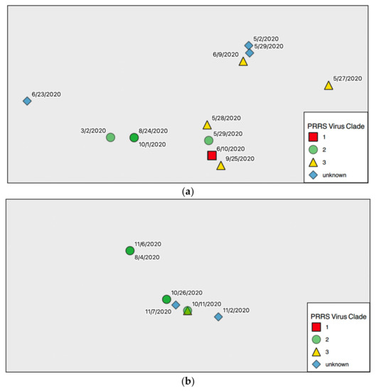 QGIS 3.10 with administrative boundary files from the GADM (www.gadm.org, accessed on 9 December 2020) were used to visualize the spatiotemporal relationships between sites and their infection status (QGIS Development Team, 2021. QGIS Geographic Information System. Open-Source Geospatial Foundation Project. http://qgis.osgeo.org, accessed on 15 January 2021). The infection status was determined by RT-qPCR for detection of PRRSV nucleic acid and through sequencing. The sequences from samples positive for PRRSV nucleic acid on RT-qPCR were classified as infected unknown (not sequenced), infected with a clade 1 variant, infected with a clade 2 variant, infected with a clade 3 variant, or not infected.