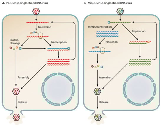 The above diagram displays the notable differences between a (+)—sense single-stranded RNA virus and a (−)—sense single-stranded RNA virus [2].