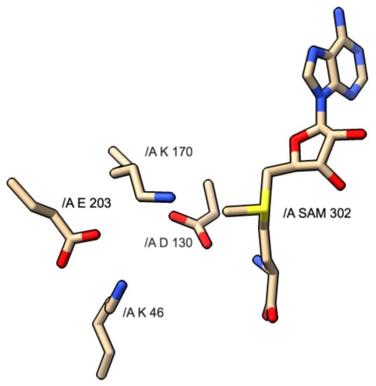 The methyltransferase domain is expected to contain the following: an invariant histidine residue, a DXXR motif, and an invariant tyrosine residue [7]. The invariant histidine residue can be noted as H65, the DXXR motif as D114/V115/Q116/R117, and the invariant tyrosine residue as Y229. The DXXR motif is defined as Motif II and proposed to comprise a portion of the SAM-binding site [13,14]. An interesting characteristic that the genome possesses is the m7G cap and polyadenylated tail that is already present before the subsequent translation of the mRNA. This virus is thus protected from the host cell to ensure optimal translation.