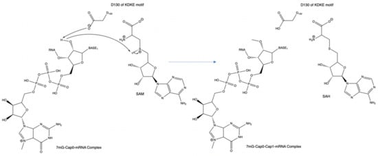 This motif is more common with the formation of cap-1 instead of cap-0, as most proteins responsible for sole cap-0 formation lack this motif. The residues involved are two lysines, one aspartic acid, and one glutamic acid. While this motif is very common, some variations can exist that are capable of catalyzing the same mechanism. In the above images, the KDKE motifs are displayed within their respective PDB files. In PDB 5M2X, the KDKE motif is K61, D146, K182, and E218. In PDB 3R24, the KDKE motif is K46, D130, K170, and E203. In PDB 6UEB, the KDKE motif is K1685, D1797, K1829, E1867. In PDB 5A22, the KDKE motif is K1651, D1762, K1795, and E1833. Figure 5 shows an example of the mechanism of methyl transfer from SAM to RNA.