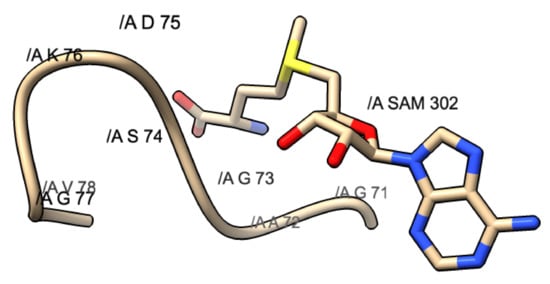 Another common motif that is found within methyltransferase domains is the glycine-rich motif. This can come in the form of DxG, GxG, GxGxG, or some other variation. This motif usually will mark the area where SAM will dock within the methyltransferase domain. Figure 6 shows an example of the GxG motif found underneath the methionine portion of the SAM molecule.