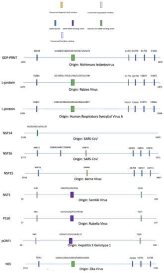 The following is found to be conserved within the methyltransferase domain of NSP1 in the Semliki Forest Virus: H38, I65, P69, R93, A103, A125, V150, P160, P183, G191, and A216. The following is found to be conserved within the methyltransferase domain of PORF1 in the Hepatitis E virus: H65, I89, P93, R117, A127, A134, V161, P171, P194, G201, and A227. The following is found to be conserved within the methyltransferase domain of P150 in the Rubella virus: H66, I93, P97, R109, A119, A141, V164, P174, P196, G204, and A231.