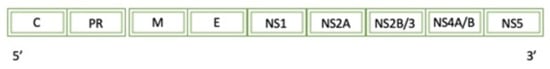 A diagram of the simplified genome for the Zika Virus: C (Capsid), PR (peptide PR), M (small envelope protein), E (envelope protein), and NS protein (non-structural protein).