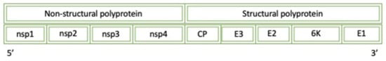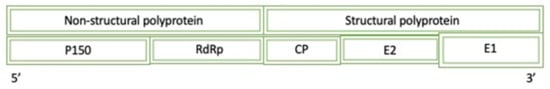 A diagram of the simplified genome for the Rubella Virus: P150 (protease/methyltransferase 150), RdRp (RNA-dependent RNA polymerase), CP (cysteine protease), and E (envelope).