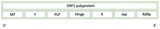 A diagram of the simplified genome for the ORF1 polyprotein of Hepatitis E Virus: MT (methyltransferase), Y (Y-domain), PLP (papain-like protease), X (X-domain), Hel (Helicase), and RdRp (RNA-dependent RNA polymerase).