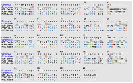 When comparing percent identity amongst the sequences, the values observed are less than 20%. When NSP1 (Semliki) is compared to PORF1 (Hepatitis E), 15.68% identity is observed. When NSP1 (Semliki) is compared to P150 (Rubella), 18.85% identity is observed. When PORF1 (Hepatitis E) is compared to P150 (Rubella), 17.84% identity is observed.