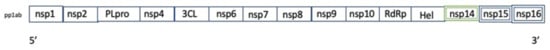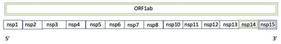 SARS-CoV is a positive-sense ssRNA virus that codes for a non-structural protein, NSP14, that has bifunctionality to act as both a 3′-to-5′ exoribonuclease and guanine-N7 methyltransferase [16]. Figure 13 displays a simplified diagram of the full SARS-CoV genome. SARS can code for an additional non-structural protein, nsp10, which only acts to enhance the activity of nsp14′s exoribonucleolytic function but not its methyltransferase activity. Based on studies cited in Reference 15, it is shown that dGTP can be recognized as a substrate but not dATP, dCTP, or dTTP. Additionally, dinucleotides such as GpppG, GpppA, or m7-GpppG can be recognized and methylated by the N7-Mtase domain. While the initial two are methylated, GpppG and GpppA, the methylated dinucleotide will not be methylated further. This further proves that NSP14 is specific for the N7 position of the first G nucleotide. NSP14 does not methylate G nucleotides internally within the RNA strand but only the G nucleotide at the front of the strand.