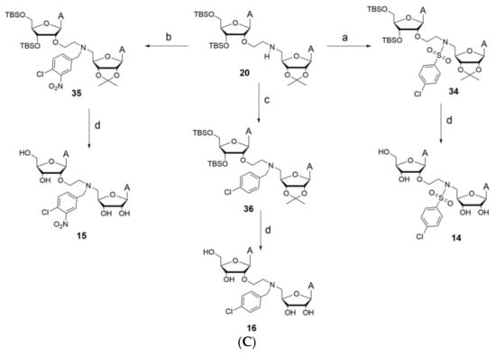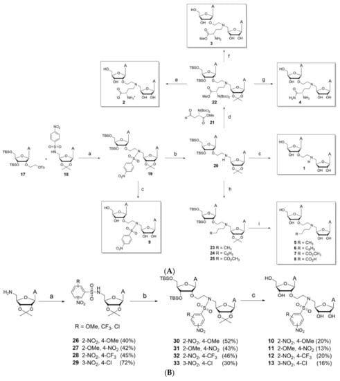 - Ahmed-Belkacem, R.; Sutto-Ortiz, P.; Guiraud, M.; Canard, B.; Vasseur, J.-J.; Decroly, E.; Debart, F. Synthesis of adenine dinucleosides SAM analogs as specific inhibitors of SARS-CoV nsp14 RNA cap guanine-N7-methyltransferase. Eur. J. Med. Chem. 2020, 201, 112557. [Google Scholar] [CrossRef]