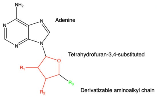 The following molecules are observed to act as inhibitors for the NSP16 belonging to SARS-CoV [28]. For NSP16 to utilize its role as a methyltransferase, SAM binds to the SAM-binding pocket to transfer its methyl group. The inspiration for these analogs stems from SAM, SAH, and sinefungin. Figure 21 shows a general scaffold design for NSP16 inhibitors. The binding of SAM, SAH, or sinefungin to its pocket does not affect the adjacent RNA molecule nor its binding pocket so similar analogs with potential inhibitory activity can be utilized to form an effective inhibitor. While no IC50 or EC50 values were recorded for these molecules, other factors were recorded and shown in Table 7 via QikProp and Glide docking scores such as QPlogS, QlogBB, QlogKp, QPlogKhsa, and docking score.