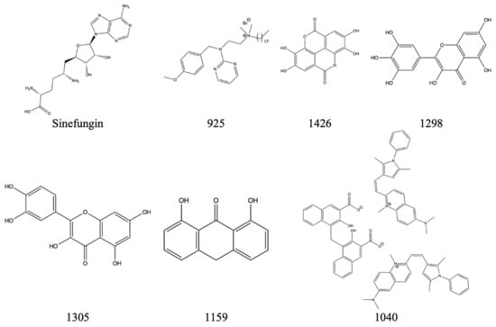 The following compounds are excluded from further testing/results due to the presence of a sulfonium ion that displayed false impressions of potential activity: 144802777, 25245977, and 140671722. This sulfonium ion was labeled as “PAINS” or “Pan-assay interference compounds”. This “PAINS” label refers to molecules that can give false-positive results within screening modalities.