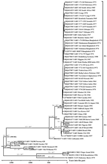 As was first established by Babkina et al. [37], all VARV strains of the 20th century are divided into two clades, namely P1 and P2 (Figure 2). According to our updated data, their separation took place around 1694 AD (Table 2); this is consistent with the dating of Mühlemann et al. [2], Pajer et al. [14], Smithson et al. [15], and Duggan et al. [12]. tMRCA of VARV strains of PI and P2 groups in our work was estimated as 1908 and 1878 AD, respectively (Table 2). These time estimates indicate the recent origin of the biodiversity of the studied VARV strains, and it has been suggested that large-scale vaccination may be the main reason for this [12,38]. In addition, the analysis of a limited set of strains isolated mostly during large outbreaks of smallpox, may not reflect the entire genetic diversity of the VARV strains circulated in the middle of the 20th century. There is little genetic diversity within the P1 group; however, historical records indicate the existence of VARV strains with different pathogenicity [1]. Indeed, analysis of the variability of viral genomes caused by large-scale vaccination can be a very interesting task. The variability of VARV genomes was suggested to be decreased after the large-scale administration of the VACV vaccination. Such reduction of the number of circulating strains was noted for some RNA-viruses after the use of vaccines and therapies [38,39]. However, a small set of available VARV strains circulated before the vaccination program does not allow for such an observation.