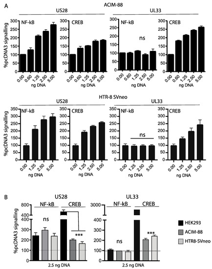 (A). Dose-dependent responses of ACIM-88 (upper panel) and HTR-8SVneo trophoblasts (lower panel) transiently transfected with either pcDNA3-EGFP, pcDNA3-US28 or pcDNA3-UL33 and the relevant CREB/NF-kB luciferase reporters. Signaling values are normalized against dose-dependent responses obtained with pcDNA3 alone. Comparisons of vGPCR transfected versus untransfected controls were made using 1-way ANOVA with Dunnett’s post-test. UL33 showed no evidence of NF-kB signaling at any dose, ns = not significant. US28 NF-kB/CREB and UL33 CREB signaling was significantly increased at all doses tested (p < 0.0001; not annotated on the figure to aid clarity) compared with untransfected controls. (B). Comparison of signaling amplitude between trophoblast lines and HEK293 cells following transient transfection with either US28 or UL33 (all at 2.5 ng), assessed using 1-way ANOVA with Tukey’s post-test. Signaling values are normalized against baseline signaling by pcDNA3 at the same dose; the dashed horizontal bar shows baseline activation levels. No differences were detected in the amplitude of NF-kB activation between cell lines; ns = not significant. ACIM-88 and HTR-8SVneo trophoblasts exhibited markedly reduced levels of CREB activation following US28 or UL33 transfection compared with HEK293 cell counterparts. *** = p < 0.001.