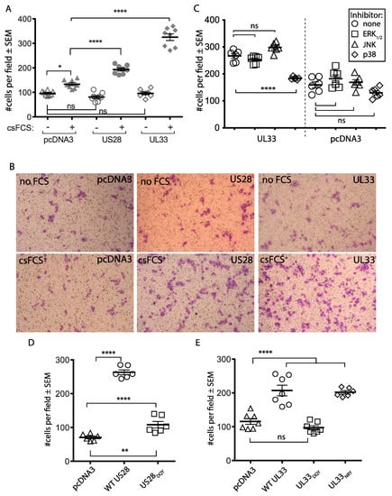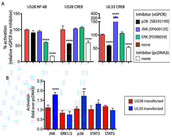3.3. Contribution of MAP Kinases to US28- and UL33 Activation of Cellular Transcription Factors