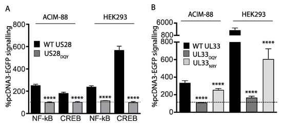 (A). Quantification of NF-kB and CREB signaling in ACIM-88 and HEK293 cells transfected with either wild type (WT) US28 or a DRY → DQY transmembrane III mutant. Signaling values are expressed relative to pcDNA3-EGFP controls at the same dose (indicated by the dashed horizontal line). Comparisons between WT US28 and the DQY derivative were made using Student’s 2-tailed t-test. **** = p < 0.0001. (B). CREB activation of WT UL33, UL33 DRY → DQY and UL33 DRY → NRY mutants in either ACIM-88 or HEK293 cells was quantified as for (A). Comparisons of the UL33 DQY/NRY mutants with WT UL33 were made using 1-way ANOVA with Dunnett’s post-test. **** = p < 0.0001.