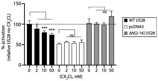 HTR-8SVneo trophoblasts were transfected with either US28, pcDNA3 or ∆N[1-6] US28 together with the NF-kB luciferase reporter. Transfected cells were incubated or not with fractalkine at the indicated concentrations. Results are presented normalized to US28 signaling in the absence of fractalkine (set at 100% and shown as a horizontal dashed line). Comparisons between fractalkine-treated and untreated controls were performed using 1-way ANOVA with Dunnett’s post-test. ns = not significant; * = p < 0.05; *** = p < 0.001.