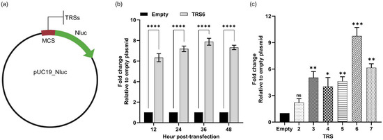 Since nluc was cloned immediately downstream of the TRS6 cDNA sequence, we hypothesized that TRS6 might exhibit eukaryotic promoter activity. To test this hypothesis, the PRRSV TRS6 cDNA sequence was cloned into a pUC19 plasmid containing the nluc gene, but that was otherwise devoid of any known eukaryotic promoter sequence (Figure 4a). Cells transfected with the pUC19-TRS6-Nluc exhibited a 6–8-fold higher luciferase signal than those transfected with an empty plasmid (Figure 4b). The data suggest that the cDNA sequence corresponding to PRRSV TRS6 is capable of regulating the expression of the nluc gene. The PRRSV genome carries six canonical TRS-B sequences, which regulate the transcription of six canonical sgmRNAs (designated as sgmRNA 2–7, respectively). To determine whether other TRS-B cDNA sequences also exhibit promoter activity, the cDNA sequences corresponding to the remaining five TRS-Bs were separately cloned into the reporter plasmid upstream of the nluc gene. Cells transfected with the reporter plasmid carrying TRS2 did not exhibit significant levels of luciferase signal compared to those transfected with an empty plasmid (Figure 3c). On the other hand, cells transfected with a reporter plasmid carrying either TRS3, TRS4, TRS5, TRS6, or TRS7 exhibited weak promoter activity, with luciferase signals between 4.04- and 9.73-fold higher compared to cells transfected with an empty plasmid (Figure 4c). TRS6 exhibited the strongest promoter activity at all time points, with the luciferase signal varying between 9- and 10-fold higher compared to cells transfected with an empty plasmid (Figure 4c).
