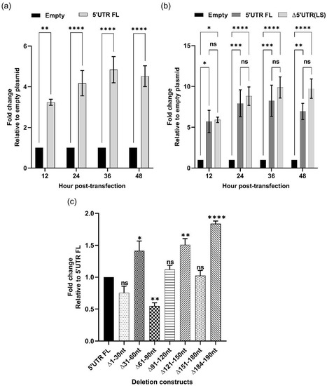 PRRSV 5′ UTR cDNA sequence possesses cryptic eukaryotic promoter activity. (a,b) HEK-293T cells were transfected with either an empty pUC19-Nluc plasmid (Empty), a plasmid carrying an intact PRRSV 5′ UTR cDNA sequence (5′ UTR FL), or a plasmid carrying 5′ UTR without the hexanucleotides corresponding to the TRS-L (∆5′ UTR LS). Luciferase signals were measured at 12, 24, 36, and 48 hpt. Data are expressed as relative fold changes compared to empty plasmid. (c) HEK-293T cells were transfected with serial 30 nt deletion mutants of 5′ UTR, and luciferase signals were measured at 48 hpt. Data expressed as relative fold change in luciferase signal compared to cells transfected with full-length, intact 5′ UTR. ns: non-significant, * p < 0.05, ** p ≤ 0.01, *** p ≤ 0.001, **** p ≤ 0.0001.