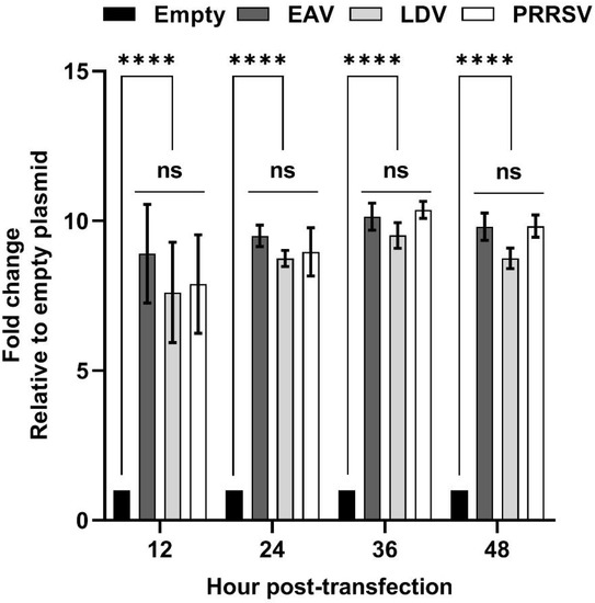Arterivirus 5′ UTR cDNA sequence exhibits cryptic promoter activity. HEK-293T cells were transfected with either an empty plasmid carrying only Nluc, or plasmids carrying 5′ UTR of PRRSV, EAV, or LDV, cloned in pUC19 vector upstream of Nluc. Luciferase signals were measured at 12, 24, 36, and 48 hpt. Data are expressed as fold change relative to empty vector. ns: non-significant, **** p ≤ 0.0001.