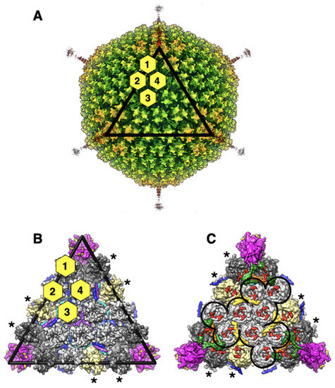 - Liu, H.; Jin, L.; Koh, S.B.; Atanasov, I.; Schein, S.; Wu, L.; Zhou, Z.H. Atomic structure of human adenovirus by cryo-EM reveals interactions among protein networks. Science 2010, 329, 1038–1043. [Google Scholar] [CrossRef]