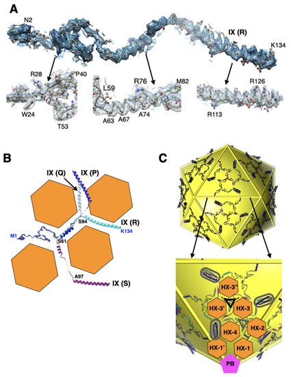 The Ad26 structure provided the first report of a well-ordered full-length protein-IX (IX) [7] (Figure 3A) that revealed the connection (linker region) between the triskelion and coiled-coil forming regions in HAdVs. Even though the linker region is fully ordered in one (R) of the four structurally distinct IXs-P, Q, R, and S, it clearly demonstrated that the N-terminal triskelion forming regions (a.a. 1–61) are structurally conserved, while the middle linker regions (a.a. 62–93) and C-terminal coiled coils (a.a. 94–134) adopt varied conformations “molded” by the hexameric bases of the hexons [19,20,21] (Figure 3B). In total, 240 copies of the malleable IXs, by displaying 4 distinct conformations, facilitate the formation of the continuous hexagonal lattice comprising triskelions and four-helical bundles (4-HLXB) that represent the nodes (hubs) of the network while the linker regions act as connections between the nodes (Figure 3C). As it was observed previously, the 4-HXLB (coiled coils) is formed by four helices belonging to four structurally unique IXs (P, Q, R, and S) that remarkably come from four different triskelions: three from the same facet and the fourth one from the neighboring facet [19,20]. It is noteworthy that the antiparallel helix, contributed by the IX (P) that comes from the neighboring facet, plays the role of “handshaking” interactions with three other helices in the 4-HLXB and is essential for forming the continuous hexagonal lattice. Moreover, the hexagonal network of IXs interlaces the hexons that form a group of nine (GON) hexons (2–4) but not the peripentonal hexons, throughout the AdV capsid. Notably, a different arrangement of IXs, distinct from the above hexagonal network, has been observed in animal and reptilian adenoviruses [22,23,24], as well as in species-F HAdVs [25,26]. Apart from overall improvements in the quality of IX models, no specific revisions were made to these models in the refined structure of Ad26.