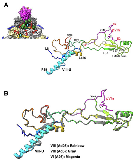 Structure and association of VIII with pVIn: (A) shown on the top left is a portion of the icosahedral facet seen from the inside of the virion (see Figure 1C for details), identifying the interior locations of two structurally independent VIII molecules, which are shown in orange (VIII-U) and yellow (VIII-V) colored surfaces and identified by cyan-colored stars. Shown on the right is a ribbon diagram of the VIII-U molecule, depicted in rainbow colors, interacting with pVIn, whose polypeptide backbone is shown in purple. Few selected residues of VIII and VI are labeled in black and red colors, respectively; (B) superposition of VIII (U) molecules from Ad26 (rainbow colors) and Ad5 (gray; PDB-ID: 6B1T) structures showing the overall structural similarity with an RMSD of 0.61 Å. However, the residues 140–149 are disordered in the Ad5 structure. The structure of pVIn is shown in purple.