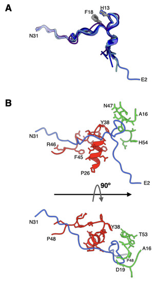 It is now clearly established that VI molecules bind and are released from the hexon cavities [27,28,33,34,35]. In the mature virions of HAdVs, multiple copies of the cleaved N-terminal fragments of VI (pVIn), composed of a.a. 1–33, are seen bound in the hexon cavities [7,27]. In the refined Ad26 structure, the directionality of the polypeptide chains of pVIn in the previous structure was reversed in agreement with the recent Ad5-wt and ts1 virion structures [27,28]. Furthermore, we identified two, two, three, and two copies of pVIn bound in the hexons 1–4, respectively. It is noteworthy that these VI segments were modeled at lower contour levels in varied qualities of densities. The structures of all these polypeptide segments are highly conserved with RMSDs < 1.0 Å for various comparisons between different pairs, most likely influenced by their interactions with the hexon subunits (Figure 6A). Notably, we see conserved stacking interactions between His13 and Phe18 residues in all the segments of pVIn. Strong interactions between pVIn and hexon subunits occur at the entrance of hexon cavity, between residues 6–27 of VI and 26–48 of one hexon subunit (e.g., HX1-B); 16–19; 47–55 of adjacent hexon subunit (e.g., HX1-C) (Figure 6B). As already noted, the residues 2–8 of pVIn interact with a.a. 140–147 of VIII at two locations. This interaction results in the β-sheet complementation by the pVIn (a.a. 2–8) residues that seem to extend the three-stranded β-sheet of VIII into a four-stranded β-sheet (Figure 5). Moreover, it appears that on average 2 copies of VI are bound to each hexon, which amounts to 480 copies of VI packaged in each virion. It is noteworthy that this number is considerably higher, compared with the estimates (359 ± 24) from mass spectrometry-based proteomics analysis of Ad5 virion [36]. It is possible that the above differences in the copy numbers of VI could be due to a different virus (Ad5) was used in the proteomics analysis.