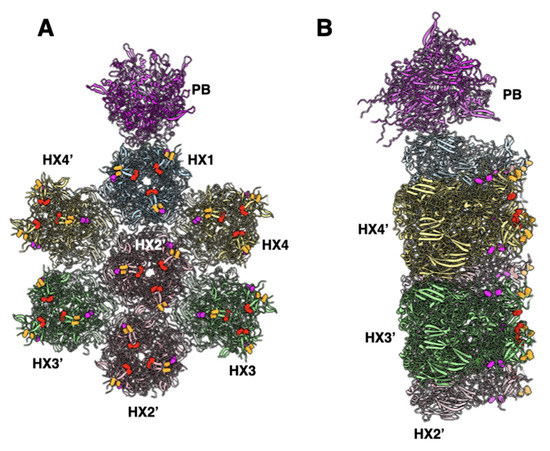 The location of FX and PF4 binding residues in the Ad5 structure (PDB-ID: 6B1T): (A) a top view showing a group of contiguous hexons identifying the FX and PF4 binding residues. The residues E424 and T425 that are suggested to bind to the GLA domain of FX [13] are shown in the red spheres, while a few of the predicted PF4 binding residues [56]-D290, D292 shown in magenta and E440 and D442 are shown in orange; (B) a side view of panel A showing the relative radial disposition of putative FX and PF4 binding residues on hexons.
