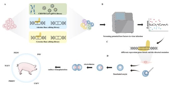 In recent decades, vaccines against porcine viral diseases have been developed to enhance the adaptive immunity of hosts [,]. However, several viruses can still escape immune surveillance [,,,,]. Accordingly, it is of great importance to develop an efficient means to protect hosts from being infected by these viruses or to block virus replication. Recently, gene-editing technology, such as CRISPR/Cas9, ABEs (Adenine Base Editors), CBEs (Cytosine Base Editors), and prime editing, has been successfully applied in pigs to increase animal disease tolerance and improve economic traits. Therefore, generating genetically modified pigs with gene-editing technology may be another feasible method to fight against swine-origin viruses. The focuses of this review are the current status of virus-resistant pigs in the world and the existing problems. In addition, we put forward two possible solutions to the problems: identifying the key host receptors in virus infection with genome-wide CRISPR/Cas9 library screening, and exploring the key amino acids of host factors in virus infection with BE-induced library screening (Figure 1).