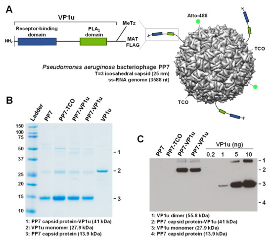 PP7-VP1u bioconjugates were assembled by bio-orthogonal click chemistry (Figure 1A). PP7 was coupled to the heterobifunctional crosslinker TCO-NHS, and VP1u was crosslinked to the heterobifunctional crosslinker MeTz-Mal. Subsequently, PP7-TCO and VP1u-MeTz were crosslinked by inverse-electron-demand Diels–Alder reaction. SDS-PAGE was performed to verify the purity of PP7, PP7-TCO, and PP7-VP1u. The PP7 bacteriophage capsid protein is visible at 13.9 kDa. Additionally, the capsid-associated maturation protein is slightly visible at 50.8 kDa (Figure 1B). Sensitive Western blot analysis showed that approximately three VP1u units were crosslinked to one PP7 capsid and that non-coupled VP1u was effectively removed after the crosslinking reaction (Figure 1C).