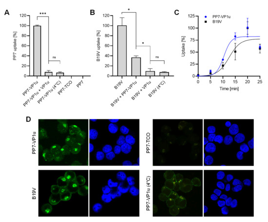 PP7-VP1u uptake into UT7/Epo cells. (A) PP7-VP1u uptake was quantified by RT-qPCR. For the competition, recombinant VP1u (500 ng) was added to the cells at 4 °C 40 min before incubation with PP7-VP1u. (B) Internalization of native B19V into UT7/Epo cells was quantified by PCR. For the competition, PP7-VP1u (10x molecular excess) or recombinant VP1u (500 ng) was added to the cells at 4 °C for 40 min before infection with B19V. The sample at 4 °C served as a negative control (no internalization). (C) Internalization kinetics determined by RT-qPCR (PP7-VP1u) or qPCR (B19V) at 5 min intervals. (D) Binding and uptake of Atto488-labeled PP7-VP1u constructs and native B19V. B19V was detected with human MAb 860-55D against capsids and stained with secondary Alexa-Fluor 488 anti-human antibody. PP7-TCO served as a negative control. The quantitative RT-PCR results are presented as the mean ± SD of three independent experiments. *** p < 0.001; * p < 0.05; ns, not significant.