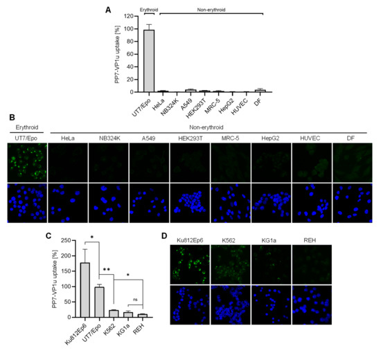 Expression profile of VP1uR in erythroid and non-erythroid cells. PP7-VP1u was incubated with different human cell types derived from non-erythroid tissues for 30 min at 37 °C. UT7/Epo served as a positive control. The internalized constructs were quantified by RT-PCR (A) and detected by fluorescence confocal microscopy (B). PP7-VP1u was incubated with different human hematopoietic cell lines for 30 min at 37 °C. UT7/Epo served as a positive control. The internalized constructs were quantified by RT-PCR (C) and detected by fluorescence confocal microscopy (D). All samples were treated with trypsin before RNA extraction to remove bound but not internalized constructs. The quantitative RT-PCR results are presented as the mean ± SD of three independent experiments. ** p < 0.01; * p < 0.05.