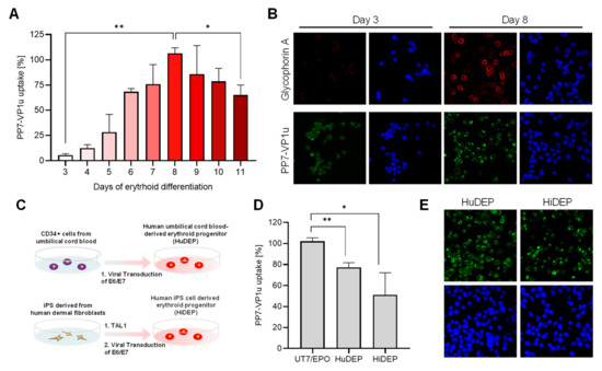VP1uR expression is upregulated during erythroid differentiation. (A) EPCs at progressive differentiation phases were incubated with PP7-VP1u for 30 min at 37 °C and quantified by RT-PCR. (B) Confocal microscopy images of EPCs at days 3 and 8 of erythroid differentiation. Cells were incubated with PP7-VP1u or immunostained with a glycophorin A antibody. (C) Schematic depiction of the erythroid reprogramming strategy [41]. (D) PP7-VP1u bioconjugates were incubated with HuDEP and HiDEP cells for 30 min at 37 °C. Internalization was quantified by RT-qPCR and compared with UT7/Epo cells. (E) Representative images of HuDEP and HiDEP cells incubated with PP7-VP1u and visualized by confocal microscopy. The quantitative RT-PCR results are presented as the mean ± SD of two (A) or three (D) independent experiments. ** p < 0.01; * p < 0.05.