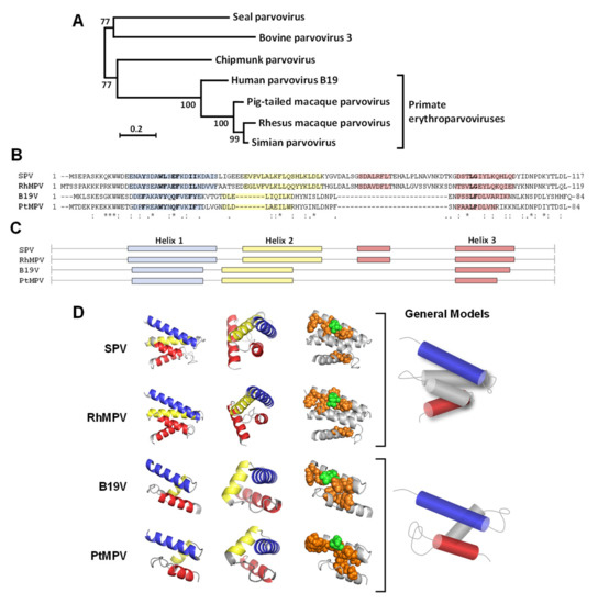 Previous investigations revealed that the B19V RBD has a well-defined structure of a three-helix fold, which forms a spatial cluster of internalization-relevant amino acids at the interface of helices 1 and 3 [27]. We compared the primary sequences located in the putative RBD within the VP1u region, and modulated in silico the RBD with the computer algorithm QUARK (Figure 5). The predicted RBD model of PtMPV exhibited a remarkable resemblance to that of B19V. The SPV and RhMPV RBD differed from the B19V RBD by an additional α-helix between helices 2 and 3. Although the primary amino acid sequences of primate VP1u regions were moderately conserved, the in silico modulations exhibited a similar spatial arrangement of helices 1 and 3. Internalization-important amino acids that were previously identified for B19V [27] were conserved by either identical amino acids or conservative replacements, resulting in a comparable spatial arrangement for all primate erythroparvoviruses.