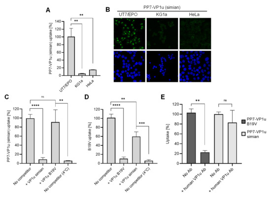Uptake of simian PP7-VP1u into human cells. Simian PP7-VP1u was incubated with UT7/Epo, KG1a, and HeLa cells for 30 min at 37 °C. The internalized constructs were quantified by RT-PCR (A) and detected by fluorescence confocal microscopy (B). (C,D) Internalization of simian PP7-VP1u and native B19V into UT7/Epo cells in the presence of competitors. Samples incubated without competitors at 37 °C and 4 °C served as a reference for maximal internalization and complete block, respectively. (E) B19V and simian PP7-VP1u internalization into UT7/Epo cells was carried out in the absence or presence of a 200-fold molecular excess of MAb 1418-1 against B19V VP1u. Internalized bioconjugates were quantified by RT-PCR. The quantitative RT-PCR results are presented as the mean ± SD of three independent experiments. **** p < 0.0001; *** p < 0.001; ** p < 0.01; ns, not significant.