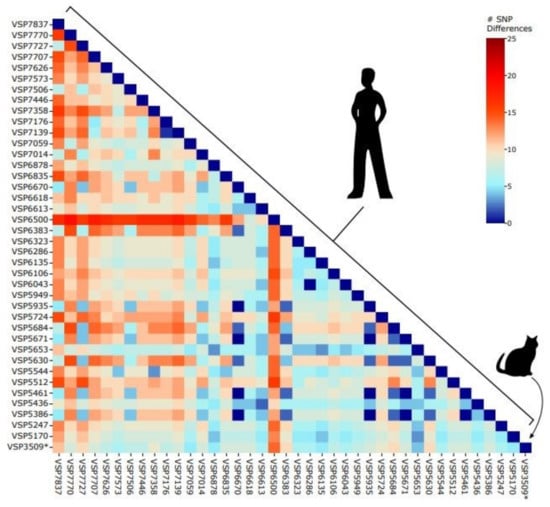 Pairwise distances between AY.3 sequences in the Delaware Valley. Included are the feline-derived sequence (VSP3509) and human-derived sequences. The number of SNPs separating each pair of lineages is shown by the color code (key to the right of the figure).