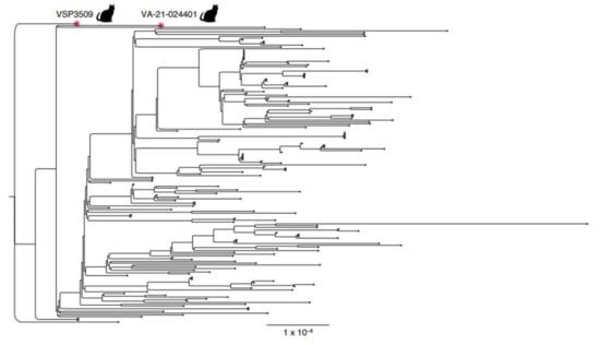 Phylogenetic analysis reveals that the cat-derived sequence from the Delaware Valley as well as the sequence from Virginia are divergent from the human sequences (Figure 2). Therefore, while there are few SNPs that differentiate the cat-derived samples from the human-derived samples nearest in sequence, the unique SNPs (Table 1) cause the cat samples to appear more distant on the phylogenetic tree. Some of these mutations may be enriched in samples from cats; however, a larger dataset is necessary to draw this conclusion.