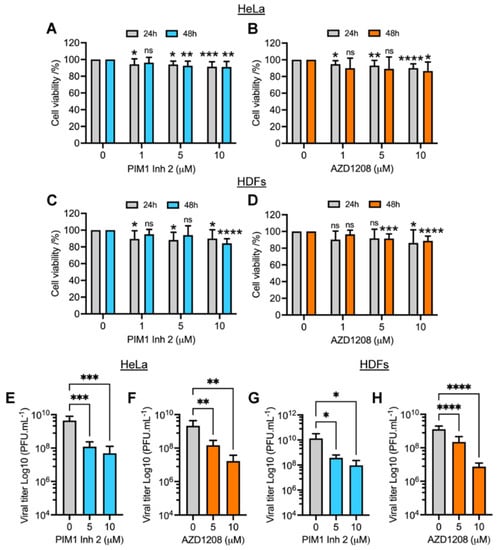 Confluent HeLa cells, HDFs or Vero cells grown in 96-well plates were treated with PIM1 Inh 2 or AZD1208 at concentrations of 1, 5 and 10 µM or DMSO (0.1%), which was used as a control. Cells were incubated for 24 or 48 h, and then, 5 mg/mL of 3-(4,5-Dimethyl-2-thiazolyl-2,5-diphenyltetrazolium bromide (MTT, Sigma-Aldrich, St. Louis, MI, USA) solution in PBS was added to the cells and incubated for an additional 4 h. Formazan crystals were dissolved in a solution of 4 mM HCl and 10% Triton X-100 in isopropanol, and absorbance was measured at 570 nm using a microplate spectrophotometer (Bio Tek, Winooski, VT, USA). Results are shown as the percentage of viable cells relative to the DMSO-treated control cells [16].